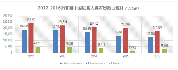 2016年南非自中國(guó)戶外家具金額高達(dá)1.25億美金,辦公家具進(jìn)口額為1.77億美金,其他家具及零部件274萬(wàn)美金。