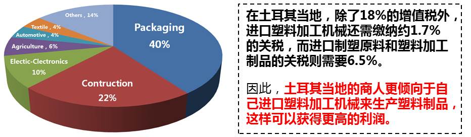 目前土耳其塑料制品主要用于包裝(40%)、建筑(22%)、電子(10%) 農(nóng)業(yè)(6%)、汽車(4%)等行業(yè) 。其中包裝和建筑塑料制品的消費(fèi)量占主要部分。