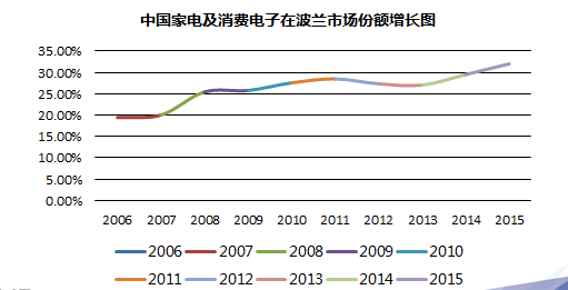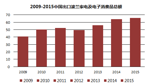 波蘭進(jìn)口中國(guó)家電及電子消費(fèi)品穩(wěn)步增加,且所占比例越來(lái)越多,2015年進(jìn)口家電及電子消費(fèi)品中32.01%來(lái)自中國(guó)。