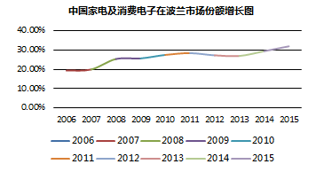 中國的家電及電子消費(fèi)品在波蘭進(jìn)口占比中逐年上升,2015年已達(dá)到進(jìn)口的32.02%。