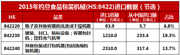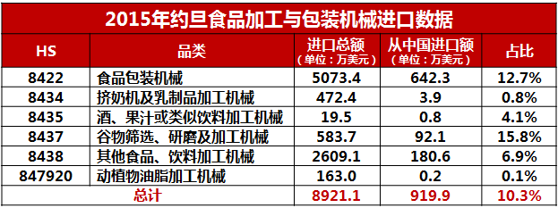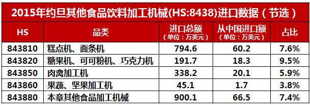 目前約旦主要進(jìn)口“食品包裝機(jī)械、其他食品飲料加工機(jī)械”兩大類設(shè)備;