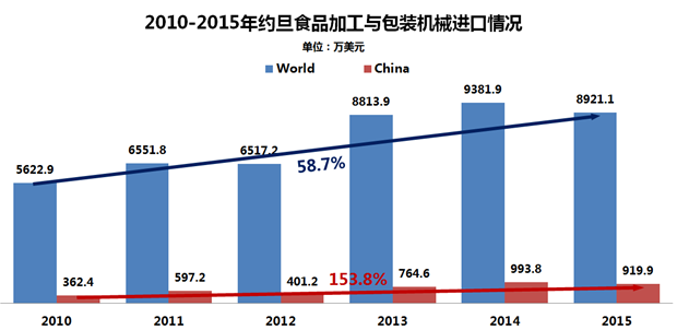 雖然約旦食品行業(yè)規(guī)模不大(國(guó)家人口僅759萬(wàn)人),但其食品加工業(yè)已初具規(guī)模,2015年相關(guān)食品機(jī)械的進(jìn)口額達(dá)到8921.1萬(wàn)美元。
