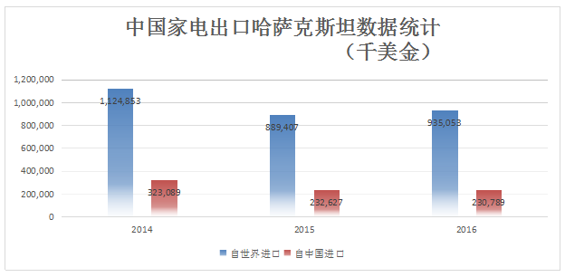 2016年哈薩克斯坦家用電器總進口額為9.35億美元,其中自中國進口2.3美元,占比24.7%。