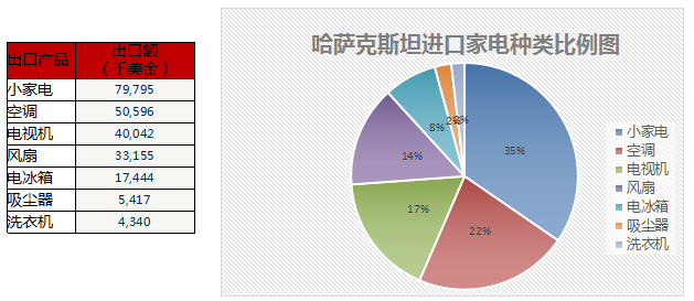 其中位居哈薩克進口(自中國)前三位的是:小家電、空調、電視機。