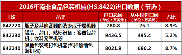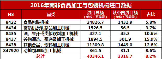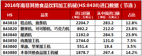 食品加工業(yè)是南非制造業(yè)重要的組成部分,目前南非主要進(jìn)口的機(jī)械包括“食品包裝機(jī)械、其他食品飲料加工機(jī)械”。