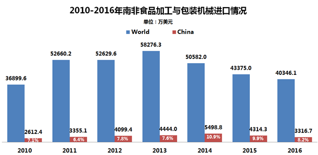 目前中國(guó)對(duì)南非出口的食品機(jī)械已達(dá)到一定規(guī)模,2016年對(duì)埃及的出口額已達(dá)到3316.7萬美元,占比8.2%。