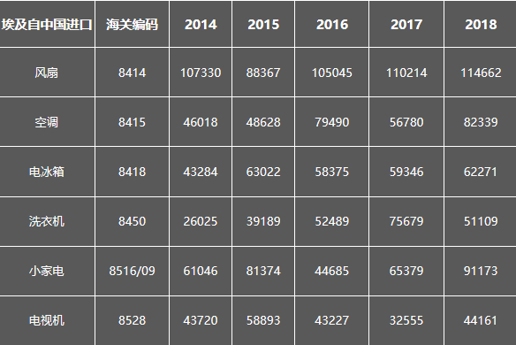 2018年埃及全球家電進口額達11.93億美元。其中自中國進口的家電占38.13%,約4.55億美元,是埃及家電第一進口來源國。