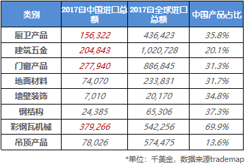 設(shè)備五金:2017年巴西自中國進(jìn)口的彩鋼瓦機(jī)械占其全球進(jìn)口的69.9%,達(dá)3.79億美元。從中國進(jìn)口建筑五金類產(chǎn)品同比增幅19.3%,達(dá)2.05億美元。水龍頭、閥門、球閥、銘牌、賤金屬鎖等產(chǎn)品均有大幅增長。