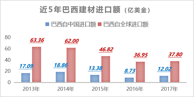 2017年巴西建材產(chǎn)品總進(jìn)口額達(dá)37.8億美元;其中自中國進(jìn)口相關(guān)產(chǎn)品達(dá)12.02億美元,占巴西同類產(chǎn)品總進(jìn)口額的31.8%。從海關(guān)數(shù)據(jù)可以看出:2017年巴西建材產(chǎn)品全球需求正緩慢復(fù)蘇,較2016年增長2.3%。而從中國進(jìn)口的建材產(chǎn)品也在逐漸增加,同比增幅明顯,高達(dá)37.7%。