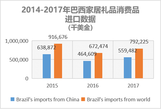 2017年巴西家居禮品及消費(fèi)品總進(jìn)口額為7.92億美元,自中國(guó)進(jìn)口相關(guān)產(chǎn)品總金額高達(dá)5.59億美元,占比69.69%,是巴西家居禮品消費(fèi)品的第一進(jìn)口來(lái)源國(guó)。