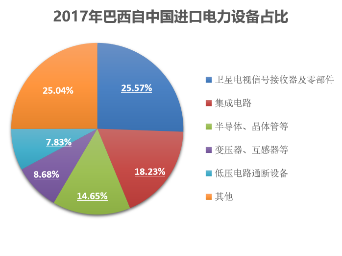 2017年巴西從中國(guó)進(jìn)口各電力設(shè)備中,集成電路,衛(wèi)星電視信號(hào)接收器及零部件,集成電路、半導(dǎo)體、晶體管等排名前三,分別占比25.57%、18.23%、14.65%。