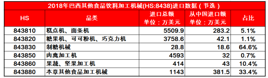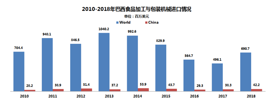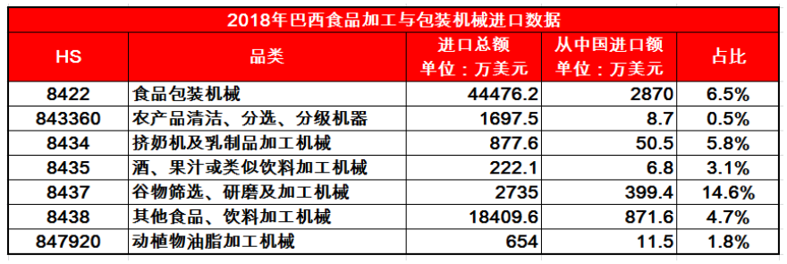 巴西是南美洲重要的食品加工市場,每年都會自國外進口大量的食品加工與包裝設(shè)備,2018年的進口規(guī)模達6.91億美元。