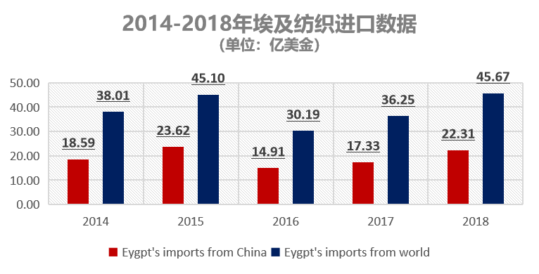 埃及70%的紗線面料和80%的輔料必須依靠進口,棉花等原料進口無關稅。2018年,埃及進口額為28.36 億美元,自中國進口13.34億美元,中國產(chǎn)品占比47.04%。