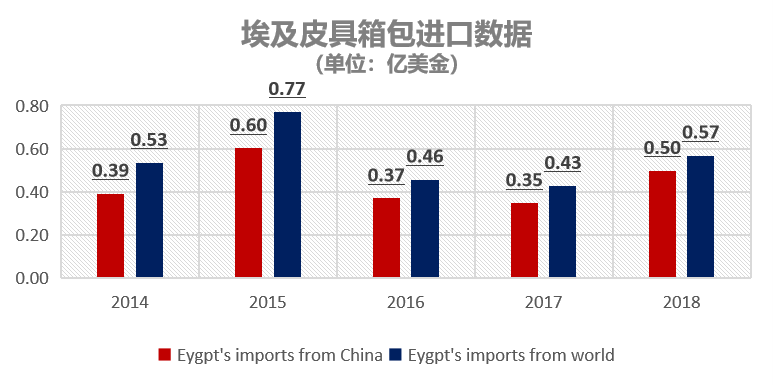 近幾年埃及箱包進口金額直線上漲。中國為埃及主要進口來源國,2018年,埃及箱包及皮革產(chǎn)品自世界進口0.57億 美元,自中國進口0.5億美元,中國產(chǎn)品占比87.24%,超過2/3的箱包來自中國,在埃及占據(jù)一定的市場優(yōu)勢。