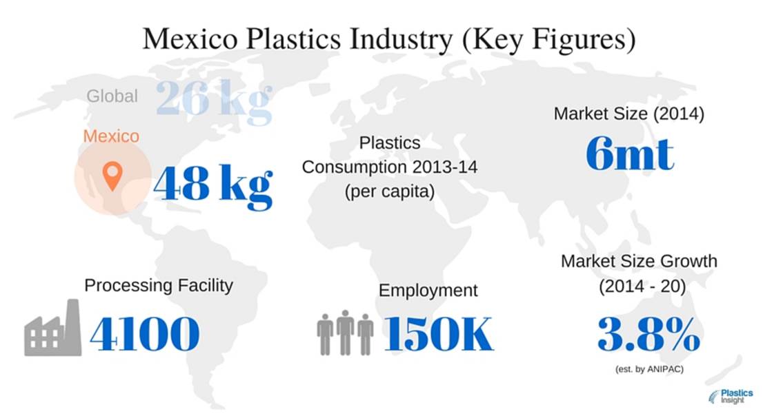 墨西哥的塑料市場(chǎng)規(guī)模有 600萬(wàn)噸(2014年)
